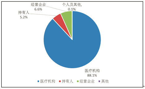持有人、經(jīng)營(yíng)企業(yè)和醫(yī)療機(jī)構(gòu)是藥品不良反應(yīng)報(bào)告的責(zé)任單位。按照?qǐng)?bào)告來(lái)源統(tǒng)計(jì),2019年來(lái)自醫(yī)療機(jī)構(gòu)的報(bào)告占88.1%;來(lái)自經(jīng)營(yíng)企業(yè)的報(bào)告占6.6%;來(lái)自持有人的報(bào)告占5.2%;來(lái)自個(gè)人及其他報(bào)告者的報(bào)告占0.1%(圖3)。