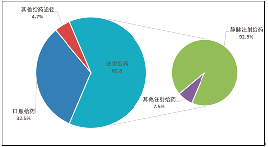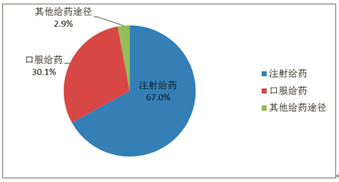 按照藥品給藥途徑統(tǒng)計(jì),注射給藥占67.0%、口服給藥占30.1%、其他給藥途徑占2.9%(圖16)。注射給藥中,靜脈注射給藥占92.7%、其他注射給藥占7.3%。