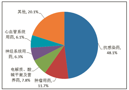 按照藥品類別統(tǒng)計(jì),化學(xué)藥品占86.6%,中藥占12.6%,生物制品占0.8%。化學(xué)藥品排名居前的藥品類別是抗感染藥、心血管系統(tǒng)用藥、腫瘤用藥、神經(jīng)系統(tǒng)用藥、電解質(zhì)、酸堿平衡及營(yíng)養(yǎng)藥;中藥排名居前的藥品類別是理血?jiǎng)⒀a(bǔ)益劑、祛濕劑、開(kāi)竅劑、清熱劑。