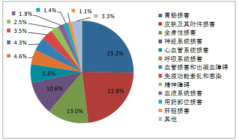 2019年國(guó)家基本藥物化學(xué)藥品和生物制品不良反應(yīng)/事件報(bào)告,按照藥品類別統(tǒng)計(jì),報(bào)告數(shù)量排名前5位的分別是抗微生物藥、心血管系統(tǒng)用藥、抗腫瘤藥、激素及影響內(nèi)分泌藥、治療精神障礙藥;累及器官系統(tǒng)排名前5位的是皮膚及其附件損害、胃腸損害、全身性損害、神經(jīng)系統(tǒng)損害以及血液系統(tǒng)損害。