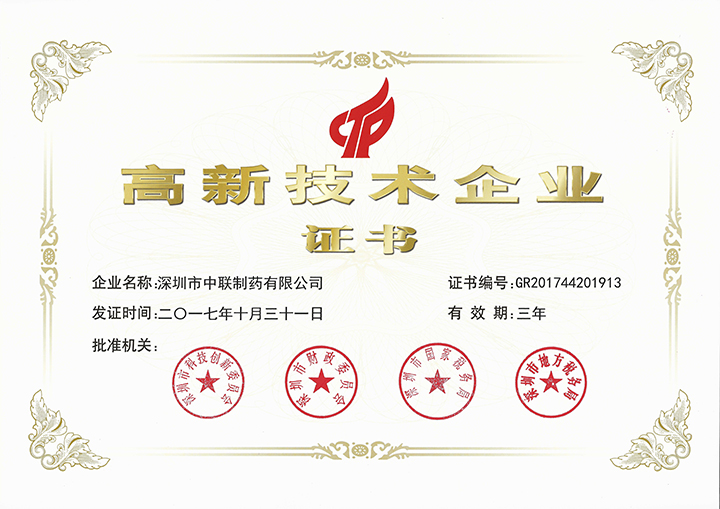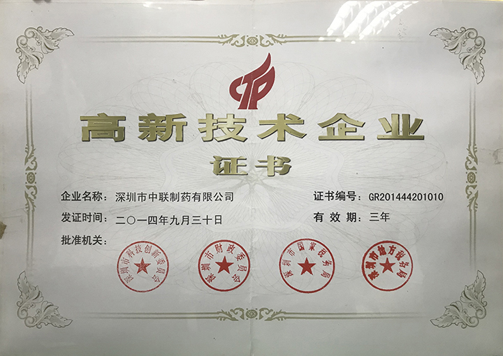中聯制藥秉持科技創新為主導,超過10%人員為研發,每年中聯制藥投入4%的年銷售于研發,憑借多個生產技術專利創造出超60%總收入,獲得從2007年至今超過10年的高新技術企業榮譽稱號。
